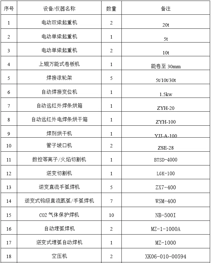 公司擅长特种材料、特殊高要求结构件的装配、焊接工艺,有较强的工艺设计和焊接工艺技术力量。公司主生产车间3800㎡(配20t和10t行车各2台、5t行车1台),有30mm卷板机1台,大型数控等离子切割机1台,500t双柱油压机1台,有自动埋弧焊机、气体保护焊机、氩弧焊机、手工电弧焊机及焊接滚轮架等各类设备62台套、发电机2台、热处理设备1台,有试验用空压机、试压泵、阀门试验柜等8台套。